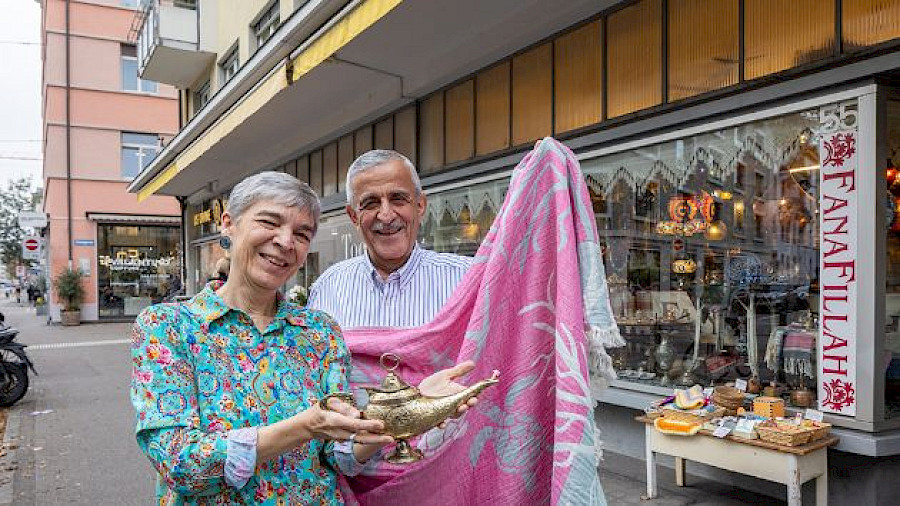 Im ersten Stock des Hauses befinden sich mehrere Arztpraxen und im Erdgeschoss Geschäfte, deren Schaufenster auf die Seefeldstrasse ausgerichtet sind. Eines davon gehört dem Laden Fanafillah, in dem das schweizerisch-türkische Ehepaar Christina Ochsner Çanak und Necati Çanak seit 1992 türkisches und orientalisches Kunsthandwerk verkaufen. Dutzende Lampen hängen von der Decke, Tücher und Schals in allen Farben glitzern, silberne Gefässe glänzen und buntes Geschirr steht gestapelt in den Regalen. Zwei Mal pro Jahr geht das Ehepaar auf Einkaufsreise, um Kontakte zu den Produzent*innen zu pflegen und besonders schöne Stücke auszuwählen. Mittlerweile haben sie Expertenstatus, wenn es um orientalisches Handwerk geht. Ihr Laden im Seefeld ist aber auch Treffpunkt für Freunde des Orients oder Heimwehtürk*innen.