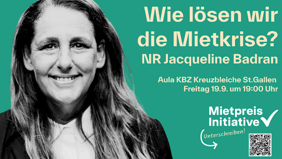 Am Freitag 19. September referiert NR Jacqueline Badran über die Mietkrise, und wie wir sie auch in der Ostschweiz bewältigen.